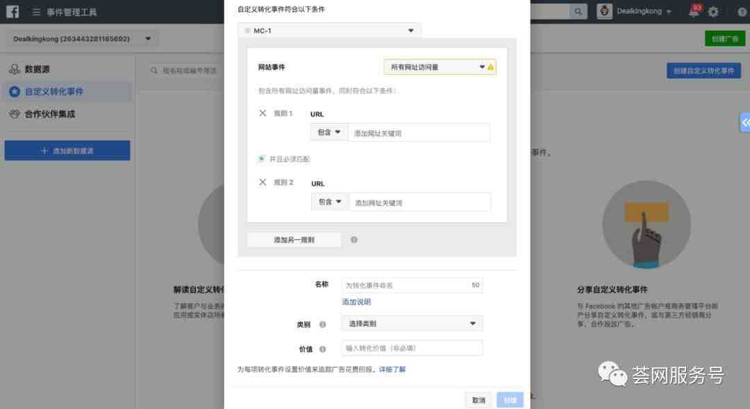 所谓自定义事件就是Facebook可以允许商家通过自己定义的客户在线行为为大家筛选客户。以上说到大家可以通过“Shopify”和“MailChimp”来获得买家数据,然而即使大家不用这两个平台,而只是用任意一个网址,都可以筛选出客户。具体方式是:大家需要创建一个网页并获取这个网页的URL网址链接,然后创建Facebook像素,之后点击“自定义转化事件”。完成后,我们把包含这个目标网址的主域名关键词(如:网址是huistore.com/huiyuan,那么我们就把“huistore”和“huiyuan”写入“规则”中,之后我们通过售后卡,或者礼品卡的形式引导买家登陆此页面,登陆后Facebook就可以帮助大家精准针对于相关目标客户进行广告投放了。