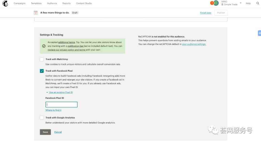 以上说到通过“Shopify”找到买家唯一不便之处在于大家需要花费精力创建一个Shopify的网站(大家如果素材完整、思路清晰,2小时就可以做好一个网站),但是如果大家不愿意这么做,那么通过“MailChimp”的Landing Page(着陆页)功能,大家也可以轻松达到与“Shopify”类似的效果。具体的做法是:通过MailChimp创建着陆页,把Facebook像素ID加入着陆页,然后为把着陆页的网址和二维码放入售后卡、或者礼品卡中即可。这种方式的优势在于大家可以在完全免费的情况下快速建立着陆页,并可以通过Facebook像素和客户Email两种方式100%锁定买家,并同时通过Facebook再营销广告和MailChimp邮件营销对客户进行所评跟进,而它的劣势在于MailChimp不具备Shopify一样的在线支付功能,同时MailChimp的新账号容易被审核。