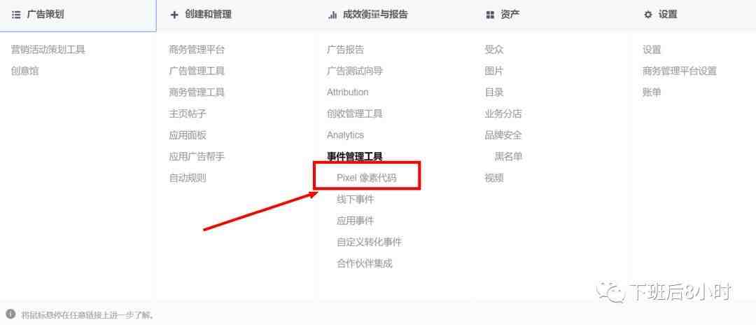 在成效衡量与报告中找到 “Pixel像素代码”如下图红色方框所示: