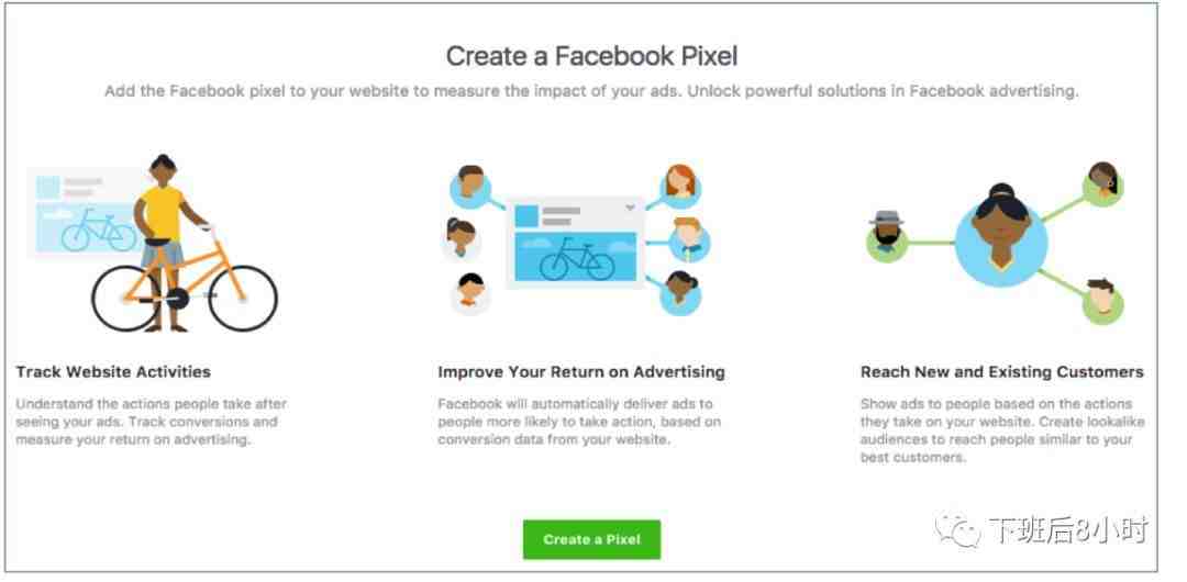 创建Facebook Pixel像素代码,安装在独立站或者合作伙伴的网站上,可以记录访客在网页上的特定浏览动作,比如“观看内容,加入购物车,点击购买按钮”等等,可以针对用户这些动作做Facebook广告的retargeting再营销,还可以看到前端广告跟后端的数据对比。前端的广告曝光跟click,有多少转化,归因到后端中去了,这对做facebook广告优化有着非常重要的参考意义