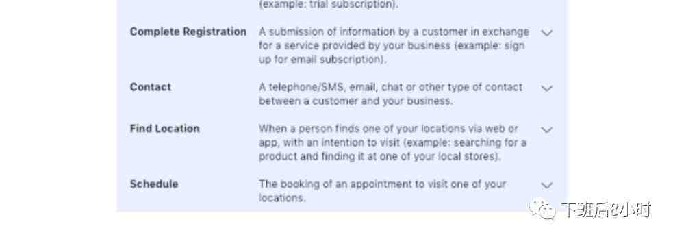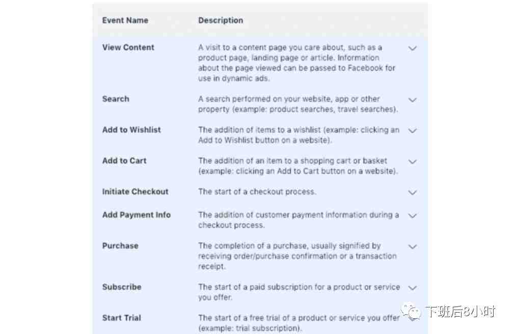 安装好基础事件的代码后,可以选择安装事件代码 Event Pixel进行更全面对用户在网上的行为进行分析,可以按照自己的需求有选择的添加,事件代码的种类很多,可以参考下图.