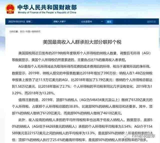 美国个人所得税主要由占比1%的最高收入者承担,1%的富裕人群缴纳的个税,超过了底部90%的纳税人个税总和。这是中国财政部网站的数据。