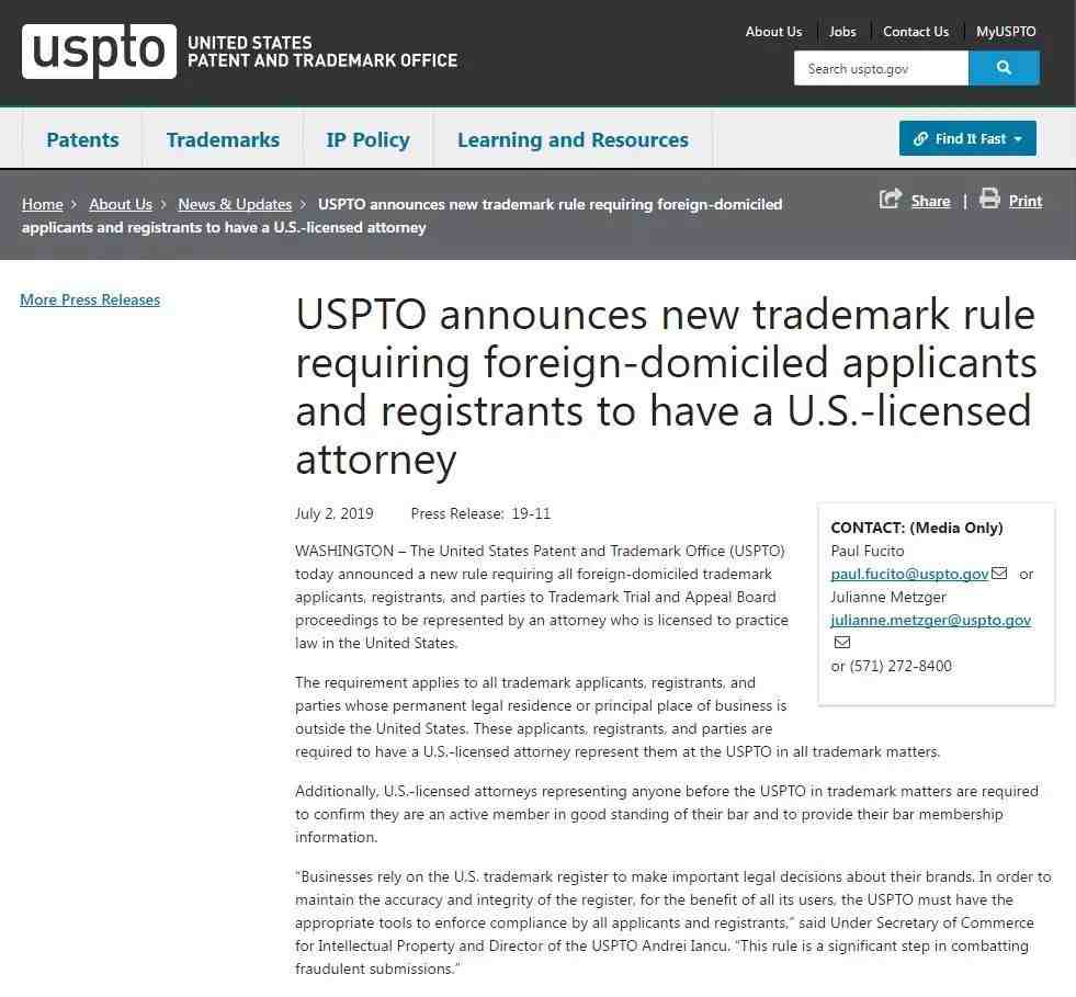 美鸥网了解到,这次预计涨价的主要原因是一项新规则——美国专利商标局(USPTO)于7月2日宣布,从2019年8月3日开始,所有外国商标注册申请人,必须委托美国当地执业许可的律师代理商标申请和跟进事宜。