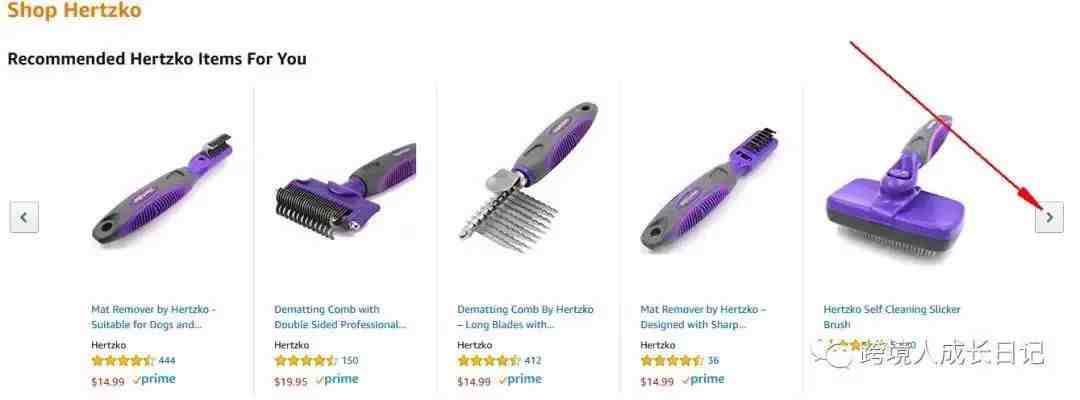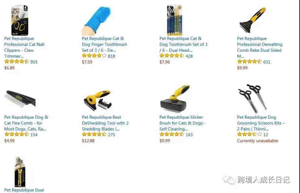 但是还是有很多人,是喜欢白色,黄色,棕色,紫色等不同的颜色。所以我们选品,可以按照这个思路。迅速的确定和缩小你的选品范围,我们再回到刚刚的店铺,仔细查看每一个产品名:例如Pet Dematting Comb、dog Mat Remover、Pet Grooming Mitt。只有你英语不是很烂,立马会发现,这个都是宠物用品,而且是宠物的护理用品,去狗毛,剪狗指甲,给狗洗澡的工具,etc。