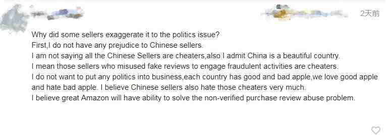 帖子下方有一位网友回复说:“我并不是说所有的中国卖家都是骗子,我也承认中国是一个美丽的国家。我的意思是那些滥用虚假评论参与欺诈活动的卖家都是骗子。”