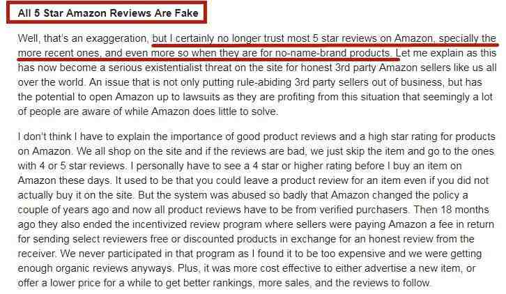 据了解,这位发表回复的人应该是一位美国卖家,这位卖家讲到他已经慢慢不再相信亚马逊上的五星评论了。下图是该卖家发表帖子的截图: