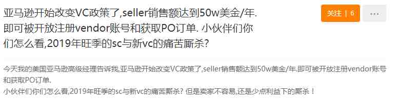 近日,有卖家表示,自己被告知亚马逊开始改变VC政策了,销售额达到50万美金/年,可被开放注册vendor账号和获取PO订单,而信息来源是这位卖家的美国亚马逊高级经理。