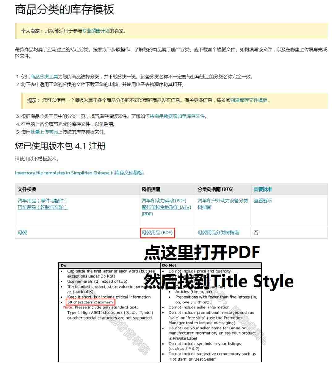 关于标题的字符限制可以在后台查询一下库存模板,然后选择自己的类目查看风格指南(PDF文件)就能看到,我搜一个baby类目大家看一下。