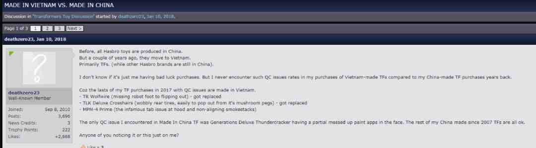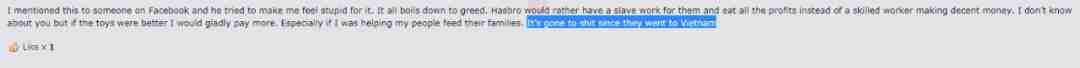 国外的朋友们就比较直接一点了。在变形金刚发烧友社区一条关于“中国制造VS越南制造”的帖子下面,有人骂了“made in Vietnam”一句X。