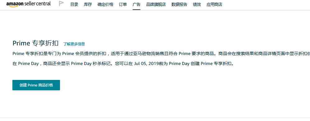 1、首先,打开prime专享折扣页面,点击“创建prime商品价格”, prime专享折扣在广告下拉框里。