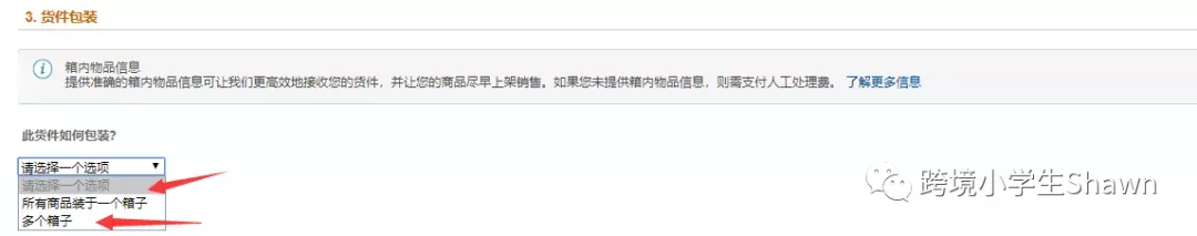 如实选择你的包装方式就可以了。发货时有多个箱子就选择“多个箱子”;发货时只有一箱产品,就选择“所有产品装于一个箱子”。