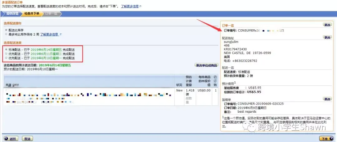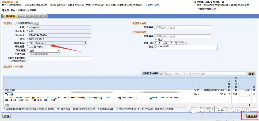 ⑵ 填入目标配送地址(美国的地址顺序是镇、县、省、州,跟中国地址相反)