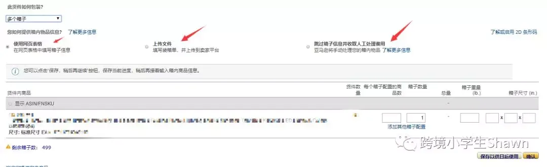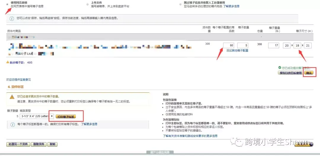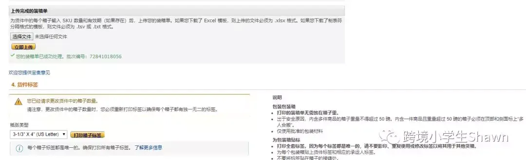当产品种类不多的情况下使用网页表格上传是效率最高的。填写好每箱产品的数量,箱子的尺寸重量后,就可以下载外箱的装箱标签了。