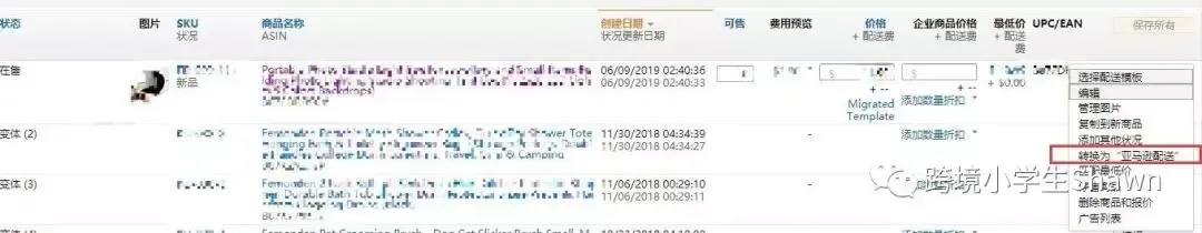 1.将已上传的产品在编辑菜单下选择“转换为亚马逊配送”