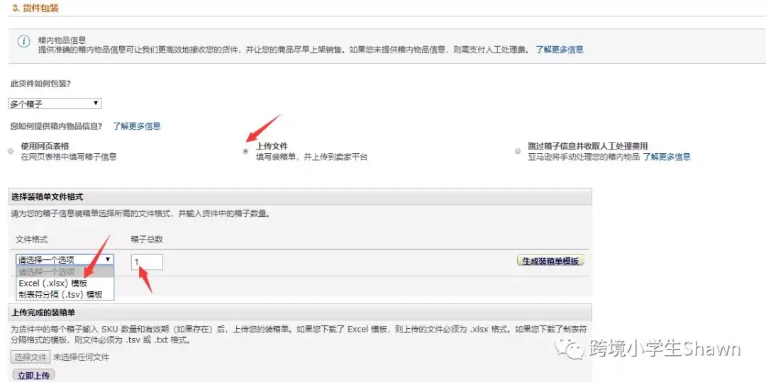 当产品种类多的情况下使用上传文件填写产品装箱信息。文件格式需要选择好Excel模版,这样下载后易于操作。选择好自己的装箱数量后,会生成一个装箱单模版,下载填写每个箱子的数量和尺寸重量信息。