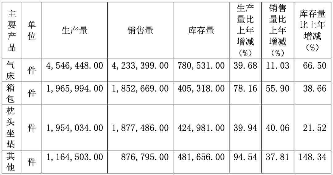 从销售数量来看,充气床显然是明星产品,去年销量达到423万件,同比增长了11.03%。
