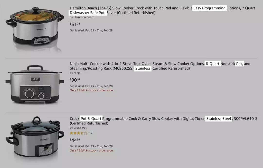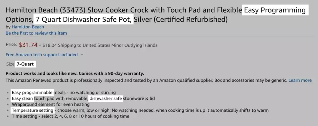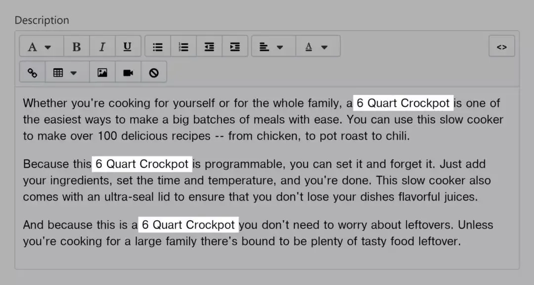 如果你的目标关键字是“6 quart crockpot”,务必保证这个关键词在你的产品说明中至少有3次出现: