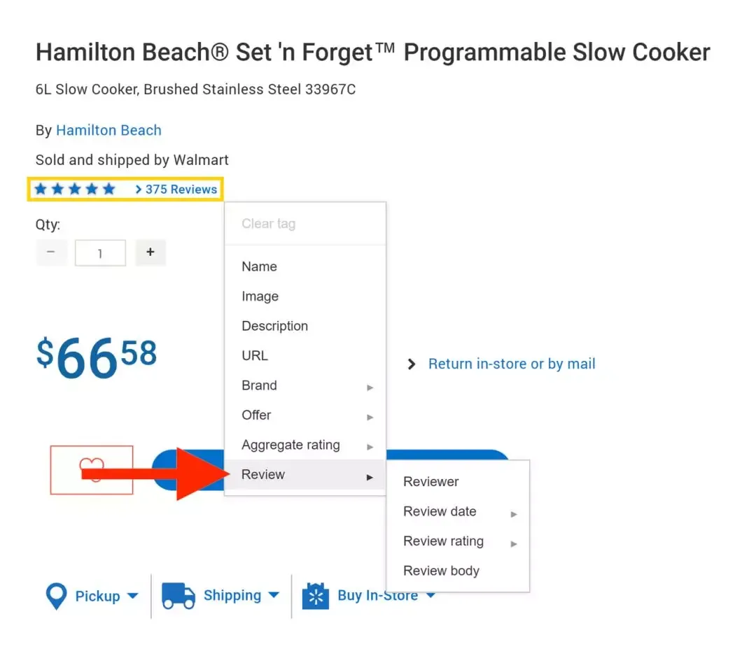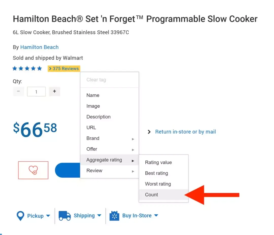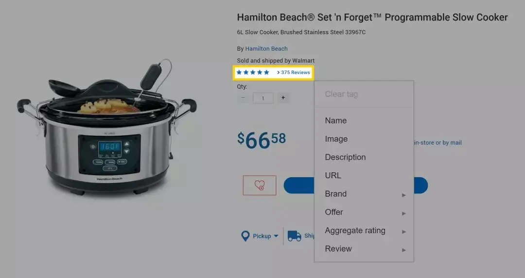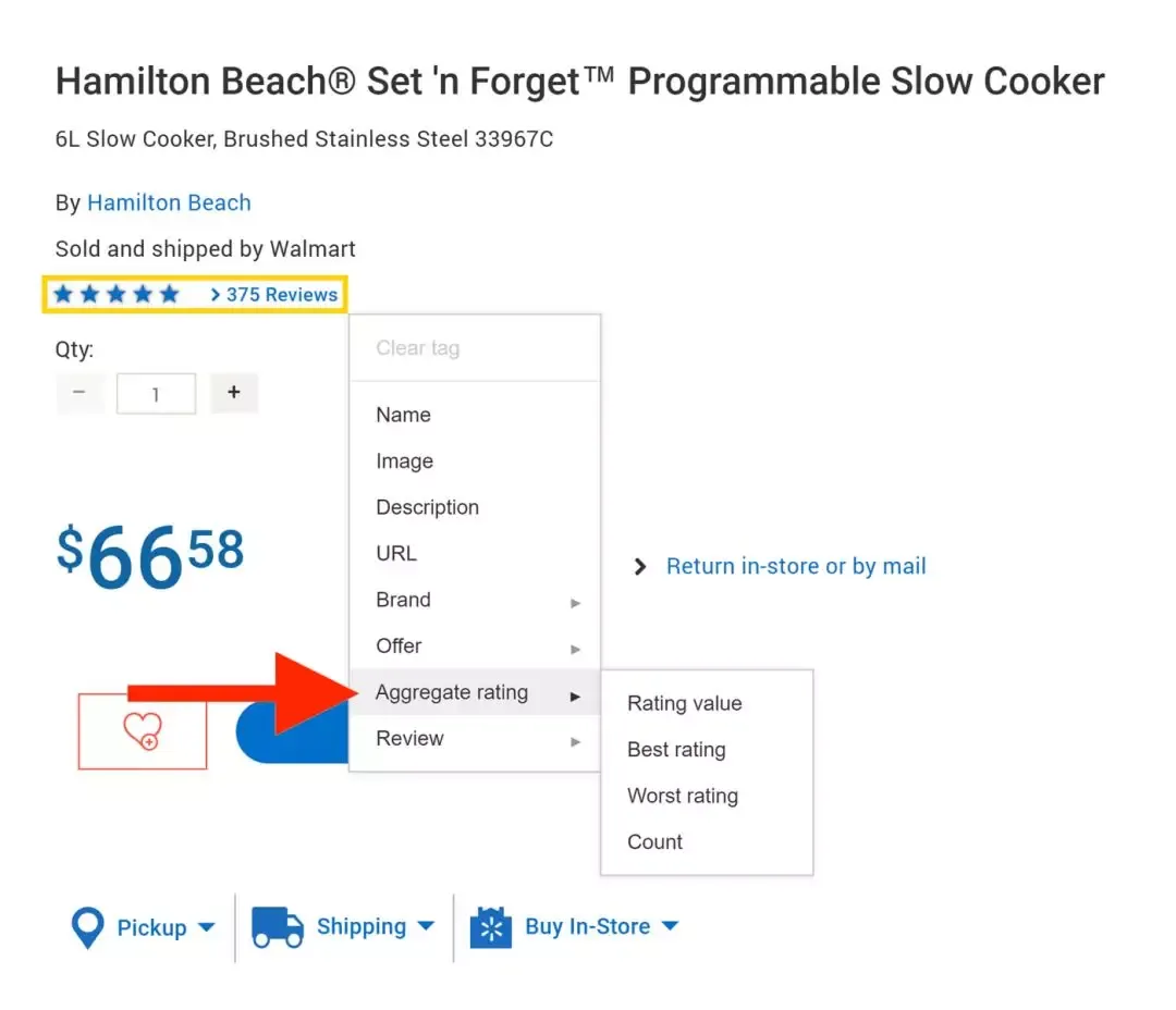 如果多个客户对产品进行了评价,突出显示评分或星级,然后选择“Aggregate Rating”。