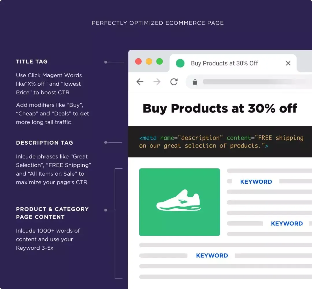 试想一下: 搜索"red Nike running shoes size 10" 的人肯定比搜索“buy shoes online" 的人购买目的和意愿更强烈,这时利用好产品关键字优化产品和类别页面就非常重要了。