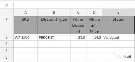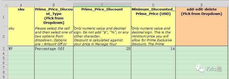 (填写SKU,折扣方式:percentage off或者money off,折扣额度,折后金额,每列都有详细解释,看看就懂了)