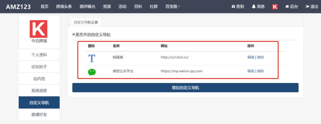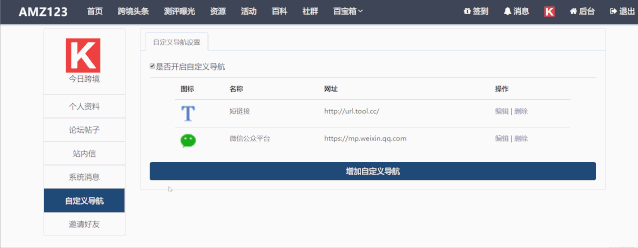 卖方通导航网站应有尽有,但每个人有着不同的使用习惯,满足不了所有人。于是,在小编强烈建议下(其实还有外部因素,哈哈),站长终于增加了【自定义导航】功能啦!谁说不能专属定制你的跨境导航呢?