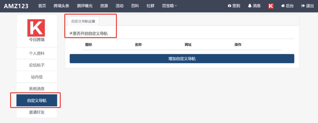 首先需要先对自定义导航功能开启设置,否则是看不到这个功能的哦~