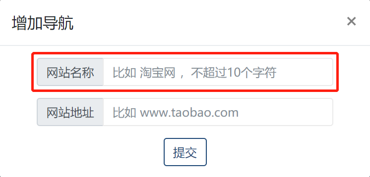 1.空白的新增导航会有一个“+新增导航”提示,直接点击,并将提前复制好需要加进来的网址,输入名称即可,如图所示:
