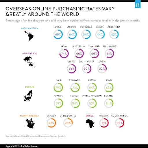 此外,伴随着互联网服务的发展以及覆盖地区的增广,跨境网购已成为网购者的主流消费方式。从大洲来看,目前网购者的平均跨境购物率为:欧洲63.4%、亚太57.9%,非洲55.5%,拉丁美洲54.6%,而墨西哥有高达七成的消费者进行网上购物,其跨境购物率达64%,已超越巴西,可见拉美第二大电商市场发展潜力巨大,蓄势待发,跨境卖家们不妨将目光投放在此,把握住发展机会。