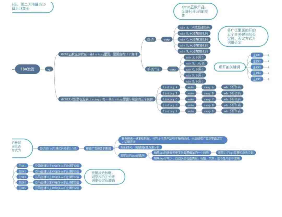 完成了测款之前的所有准备,我们接着往下看第二张图,图中按照测款的不同办法。这位同学分为了两种模式:一种是FBA发货模式,另一种是FBM自发货模式。
