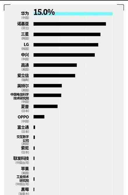 专利数据公司IPlytics报告显示,截至2019年4月份,华为拥有1554族5G标准必要专利,全球第一。中国四家公司拥有全球36%的5G标准必要专利。如封杀华为、中兴,欧洲建5G要多花4287亿人民币,晚一年半。此种延迟将使用欧盟与美国之间的5G普及率在2025年之前扩大15个百分点。
