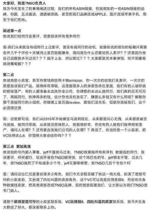 不过,人家TNSO今天站出来澄清,这都是被同行恶搞的,自己的品牌甚至改成了APPLE。并邀请“VC玩得贼6,四处叫嚣的卖家”上门喝茶。并声称自己没有给同行上过差评,没有恶搞过同行的动机。