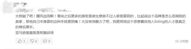 一位卖家表示,做生意做不过人家就耍阴的,比起说这个品牌是怎么恶搞别的卖家,那他自己本身耍的这种手段更阴毒!我更相信这个恶意篡改他人listing的人才是真正的幕后黑手,亚马逊简直就像刺激战场!