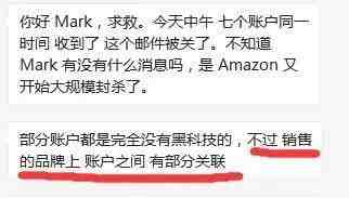 然后问问亚马逊是不是又开始大规模封杀账号了?其实,亚马逊哪有那么多大规模运动,毕竟卖家们能为他们创造很多价值的,也是他们的利润来源。Mark看了下这位卖家发来的消息,顿时就明白了,他的账号之间品牌上是有部分关联的;Mark不知道他是否对不同的账号做了各种防关联措施,但从这一句话就可以看出,此卖家还是犯了一些低级的错误,很有可能是被系统捕捉到7个账户关联,所以一并发出了同一个邮件,关了!