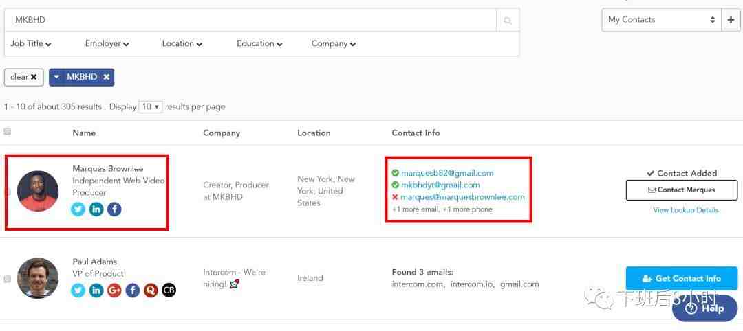 方法一:直接输入他的channel名字“MKBHD”在rocketreach搜索框,会弹出以下信息: