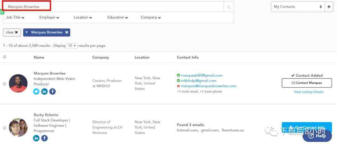 方法二, 接输入他的名字“Marques Brownlee”在rocketreach搜索框,会弹出以下信息: