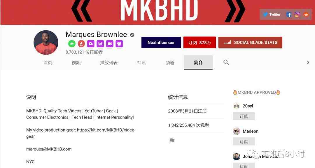 知道这个Channel的名字是Marques Brownlee,如果在下面简介下面没有留下任何邮箱,也把他留下的所有社交媒体账号都看了一遍,没有留下任何邮箱或者联系方式,就可以使用Rocketreach找出他的邮箱。