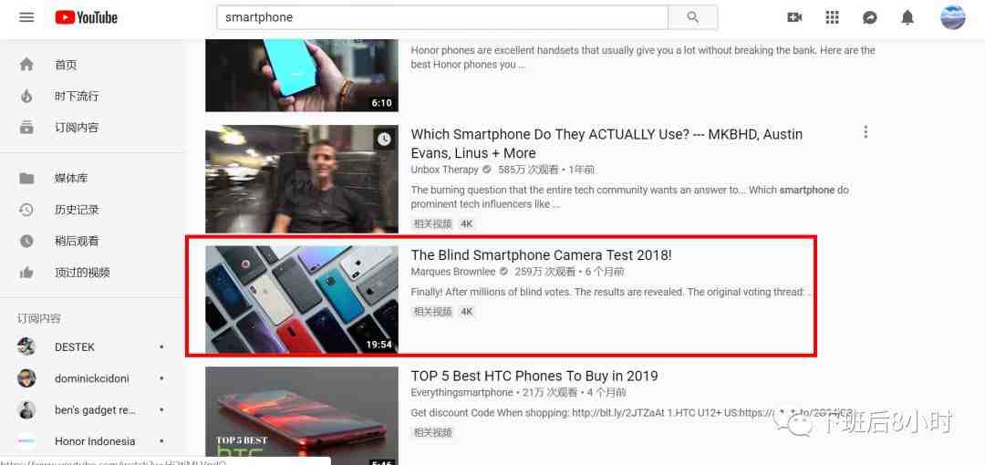 还是以Smartphone产品为例, 在youtube搜索框内输入“Smartphone”,找出比较感兴趣的红人,比如以下图红色方框Marques Brownlee频道为例,我们点击进去到"简介"那一栏。