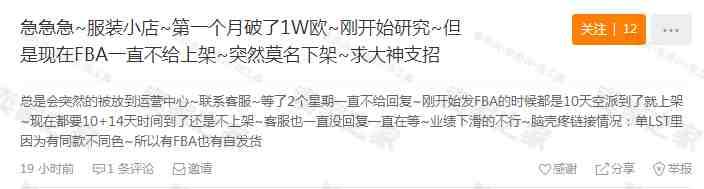 这不,小编今天从论坛上得知,有位卖家的产品,突然莫名下架,发出的货物FBA也不给上架,导致业绩下滑严重,这又是什么情况?亚马逊不会无声无息又搞什么幺蛾子吧!
