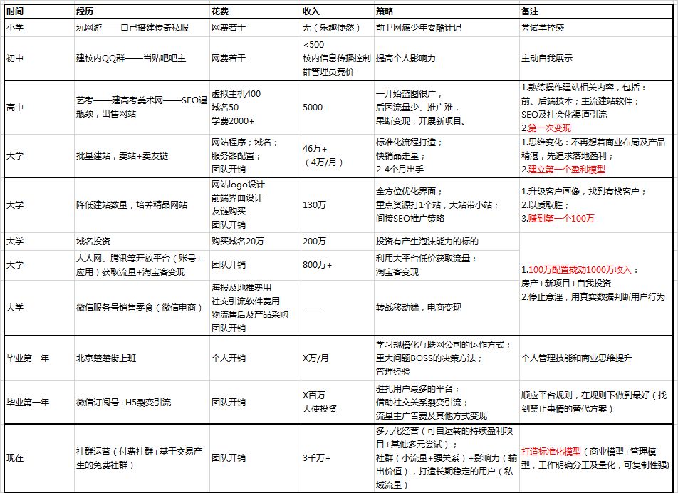 向左滑动查看全部 从上图中,能够最直白看出来的内容,有2点: 1.项目具有可复制性,能够批量制造最大利润; 2.钱是从少赚到多的。 可复制性这一点在之前的文章里已经强调过很多次了。咱先聊第二点:钱是从少赚到多的。 乍一听是不是觉得很简单?道理都懂,但就是过不好这一生既视感? 接下来摆出你可能踩过的3个坑: 1.特别喜欢做最完美的规划,最棒的蓝图,最好的产品; 2.瞧不起简单的事情,觉得太LOW以至于觉得没必要; 3.太死心眼,该放手时不愿意放手。 那啥,我不知道你,反正这三个坑我全踩了,刘大猫也踩过。 刘大猫是怎么从采坑无数做到财务自由的呢? 我的分析结果如下。 要积累原始资本,才能有更多机会 我上大学那会儿,偶尔会买彩票,浑身上下只有十来块钱,幻想着自己赚了100万后该怎么花。 有100万太舒服了好吗!这个两极分化的社会,穷人越穷富人越富,我要有100万,我就投资,买股票买基金,就算是存银行,利息都够我每天吃喝了。 这跟我看过一个故事,乞丐说,假如我当上了皇帝,一定要拿金饭碗去要饭。 思维限制了我们当下的选择,想那么多蓝图和规划,也不过是管窥一方而已。 观察上图,你会发现刘大猫的收入曲线图如下: 从0开始,通过一点点的原始积累,撬动更多资源,创造更多利润。线越抖,说明批量化越成功。线变得平缓,说明开始尝试新项目。 用刘大猫的原话说就是“每个阶段都有每个阶段的成功”,及时变现,把现有的资源换成子弹,投入下一步的发射。 互联网盈利模式,无非就是流量+变现。 流量的切口很多,不能自己建站,那就依托各大渠道,渠道上到处都是人,有人的地方就有市场。 现在有各种各样的渠道可以选择,抖音短视频、微信公众号、今日头条、微博等等。 最近爆出来的抖音小龙虾事件,其实也就是依托平台,赚取流量,然后快速变现。 (友情提醒:作为社会主义接班人,变现道路千万条,道德底线第一条(˶‾᷄ ⁻̫ ‾᷅˵)) 目前变现最大的三个方式是: 广告、知识付费、电商。 如果选择做电商,尽可能缩短供应链(比如淘宝客),把注意力集中在核心业务上。 别太把自己当回事儿,不要好高骛远。从最小的点做起,坚持做到最小细分领域的best seller, 你就能够赚到第一桶金。 第二:该放手时别犯倔,小步快跑,快速迭代。 斗地主玩过吧?一开始只有3000欢乐豆,当你积累的欢乐豆足够多的时候,你就能够进入更大的场子,玩更大的局。 那假设有这么个挑战机会摆在你面前,入局时间仅剩2分钟,你没钱,你怎么入场? 哇,那肯定是能卖的都卖了,孰轻孰重心里有数啊。 同理,如果现阶段的项目走不太下去了,或者有更好的机会,及时变现,拿着钱进入新的场次。 咱们有经验,还能打造可复制的商业模型,畏畏缩缩的怎么成事儿啊? 犹豫徘徊,等于白来。 那如果是装备位置不够了,新的装备没地方放,这咋办? 时间有限的情况下,直接把旧的装备丢了啊。 可惜吗?可惜,但是没关系。都是小钱,要充分认识到现阶段最重要的东西,然后及时把握住它。 找到最务实的方向,配备超强执行力,专注地去干。当你赚到第一桶金的时候,什么迷茫,不存在的,只想抓紧机会搞钱好吗! 从0-100万有点难,但是你看人刘大猫的发展轨迹,一旦有了一定资产,从100万到1000万简直不要再轻松了好吗! 有了原始积累,就不再需要廉价出卖自己的时间,也不会被无关紧要的事情束缚,可以更专注,也会更有动力。 给自己赚钱诶!1000万都是自己的诶!哇,刺激死了好吗! 有原始积累后,要进行基础设施建设 基础设施建设,就是需要前期投入很多时间和精力,建好后可以带来持续回报,边际成本越来越低的项目。 修公路建高铁,这就是基础设施建设。 知识付费,卖课,这也是基础设施建设。 也就是说,前期需要打造好你的可持续盈利的产品,然后往死里推他就行。 你看人家流利说,那成人英语市场打的,员工3000人,2000多个是社群运营,卖课的,一个月流水至少1个亿。 第一:内容为王。 流量经济里,抓住用户注意力是第一要素。 好的内容,能够最大限度的抓取用户(和搜索引擎)的眼球,获得最大曝光,以及个人品牌加成。 虽然现在短视频特别火,但是文字仍然是整个互联网系统上占比重最大的部分,写作是最好的流量来源。 写作分为两块:写作能力+写作策略。 大部分人的写作能力都不赖,但是这写作策略吧,很少会从商人的角度去思考。 你看日更这玩意多火呀。 但是咱算个数,以微信公众号为例,300篇文章,每篇文章阅读量500,和一篇文章阅读量10万,问,哪个公众号的粉丝数量更多? 相必你心里已经有数了吧。 就根据刘大猫的项目经历来看,你要是不知道写啥内容用户喜欢,也不太确定自己能不能写出点爆款文章来,咱先做点快销品走量,边做边看,提高提高写作能力。 但是当你有一定写作能力了,你有清晰的定位了,那你完全可以打造属于你的精品内容。提高质量,不断打磨,其余时间用来做分发、做推广,给予充分曝光。 第二,私域流量。 思域流量讲得浅白一点,就是社群——能建立强关联的社群,你去哪他也去哪的那种。 (具体的私域流量玩法我们下篇文章细聊) 刘大猫举了个例子,如果一个人有1000个铁杆粉丝,无论你创作什么作品,这些粉丝都将支持你,你便能以此糊口。 依附在平台上的玩法最终还是受平台掌控,要主导自己的命运,势必要获得稳定用户,那么社群是最好的托付端口。 社群变现有两种:一种是