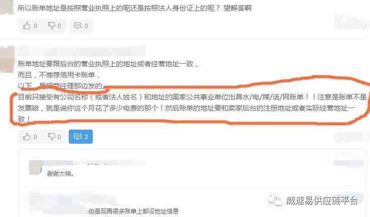 一位小白卖家发出疑问:水电费账单是否可以用信用卡账单代替?有卖家的建议是:个人可以用信用卡账单代替,企业的话得是银行账单且带有营业执照上的地址。