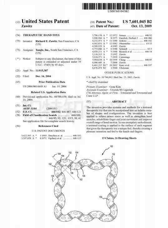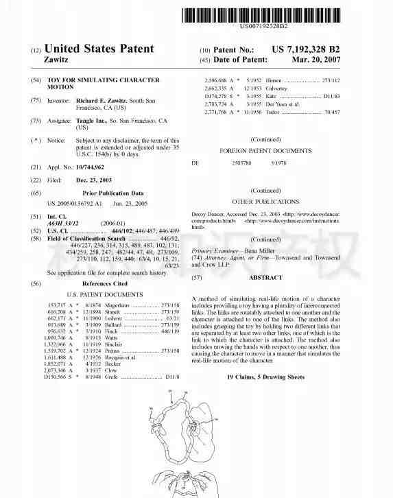 除了商标,Tangle这款玩具从2003年起就着手就行了专利方面的布局。从其美国发明专利来看,Tangle将这种缠绕玩具的独特衔接方式、表面纹理设计等写入了权利要求中。虽然这个缠绕玩具看起来构造简单,却处处隐藏着侵权风险。