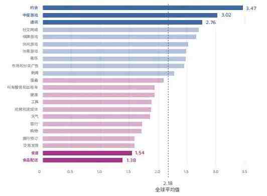 因为会话表现会关系到产品与用户的交互情况,所以会话一直是判断付费流量质量的重要指标。报告显示,约会和通讯等社交软件拥有最高会话水平。食品配送会话量最低。