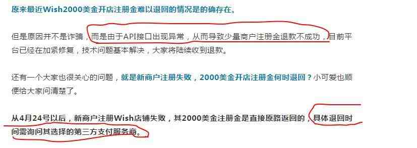 Wish方面还表示,从4月24号以后,新商户注册Wish店铺失败,其2000美金注册金是直接原路返回的,具体退回时间需询问其选择的第三方支付服务商。