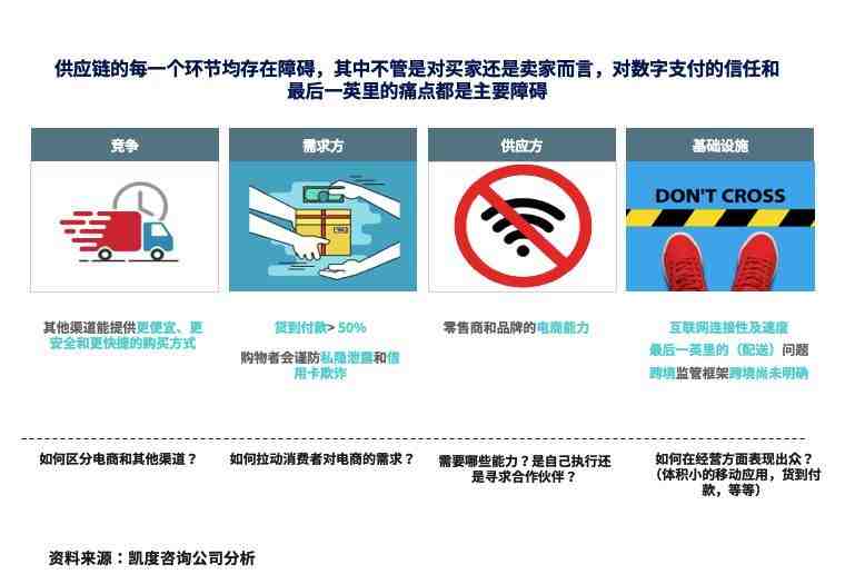 普遍而言,供应链的每个环节均存在障碍,而对数字支付的信任和最后一英里的痛点是主要障碍。与跨境销售相关的电商法规尚未明确,缺乏正式统一的地址系统,都是导致最后一英里配送困难的重要原因。尽管存在诸多挑战,所有类别的竞争却都在加剧,例如纯电商零售商和电商专家的投资活动日益活跃。
