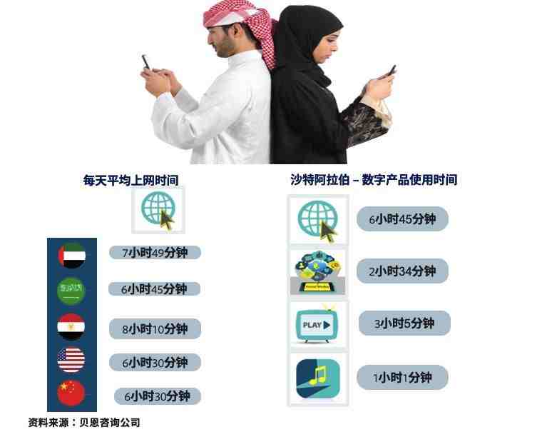 中东是全世界数字化普及率最高的地区之一,手机高速增加数字产品的使用时间,而且该地区以年轻人为主体,拥有大量数字产品的重度使用者。