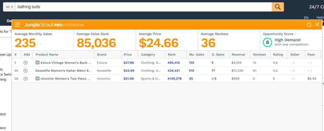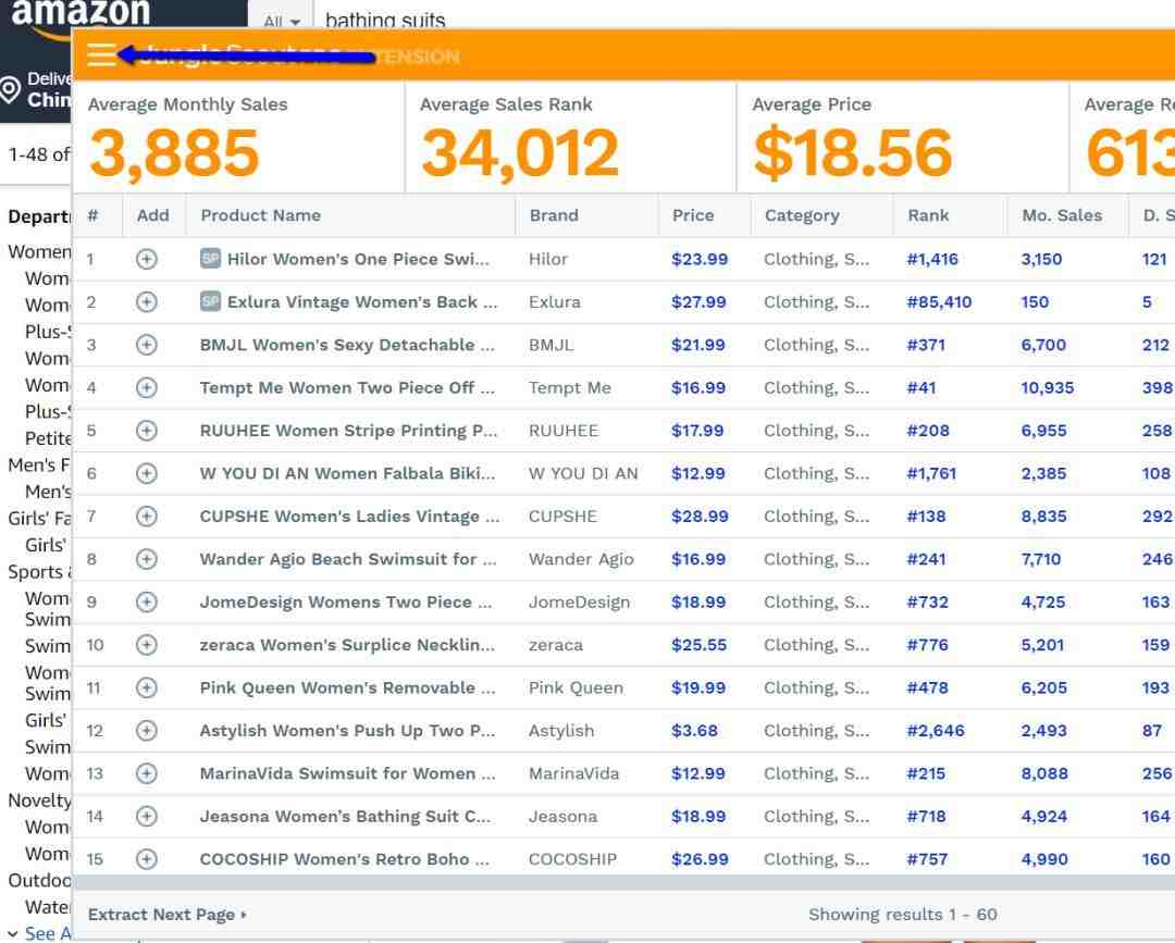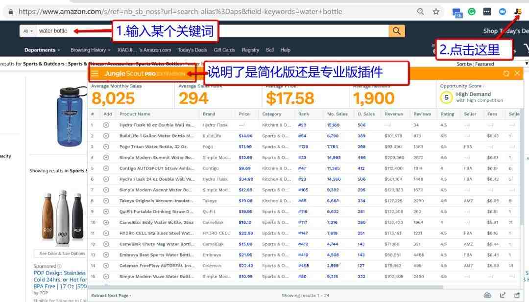 打开亚马逊网站,输入某个关键词,再点击JS图标,眨眼之间,插件就把这个页面上的产品数据都刷出来了!