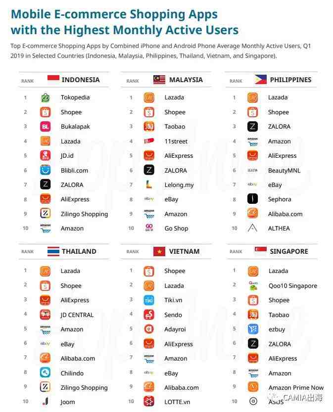 近期iPrice Group与App Annie总结出2019年第一季度东南亚最常用移动购物应用程序榜单,具体如下: