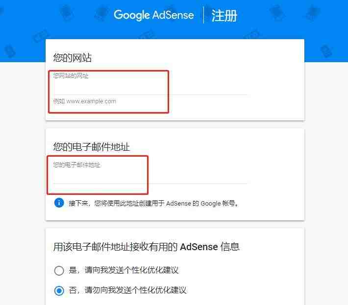 2.如实的填写 Google Adsense 注册表单,网站地址和邮箱账号,点击保存并继续按钮如下图所示: