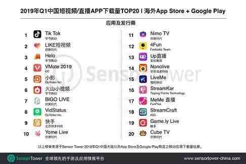 Sensor Tower 商店情报平台公布 2019 年第一季度中国短视频/直播类应用,在中国大陆以外 App Store 和 Google Play 下载量及收入排名 TOP20。