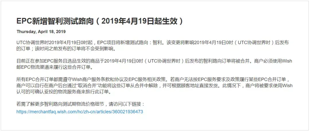 4月18日Wish发布公告:4月19日起,Wish物流EPC新增智利测试路向。
